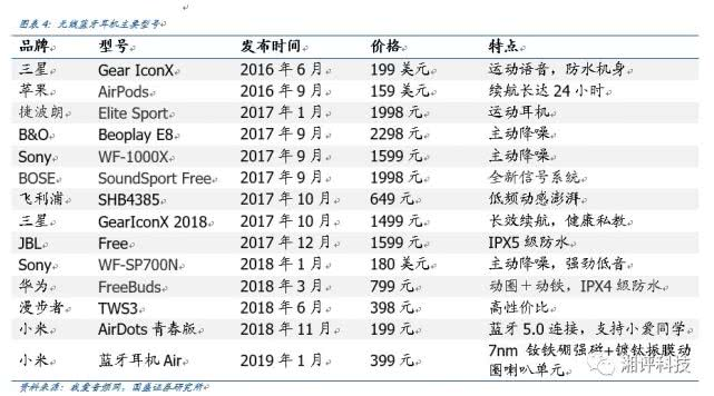 除此之外,各大芯片廠商也紛紛順應(yīng)TWS無線耳機(jī)的趨勢,推出了一系列支持TWS無線藍(lán)牙耳機(jī)的產(chǎn)品。隨著藍(lán)牙5.0技術(shù)普及,無線藍(lán)牙耳機(jī)的成長勢頭良好,未來幾年有望迎來爆發(fā)式的增長。