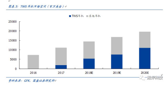 根據(jù)GFK數(shù)據(jù),2016年無線耳機(jī)出貨量僅918萬臺(tái),市場規(guī)模不足20億元。GFK預(yù)計(jì)2018年無線耳機(jī)出貨量同比增加41%,市場規(guī)模將達(dá)54億美金。到了2020年TWS無線耳機(jī)的市場規(guī)模將達(dá)到110億美金。預(yù)計(jì)隨著無線耳機(jī)音質(zhì)以及功能性持續(xù)改善,未來無線耳機(jī)的滲透率有望繼續(xù)提升。