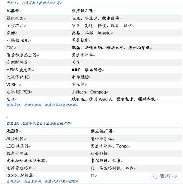 無線耳機(jī)的元器件主要包括主控芯片、存儲(chǔ)芯片、FPC、語音加速感應(yīng)器、MEMS、過流保護(hù)IC、電池等,涉及的A股供應(yīng)商包括立訊精密、兆易創(chuàng)新、韋爾股份、歌爾聲學(xué)、欣旺達(dá)、鵬鼎控股等以及一些中國臺(tái)灣廠商例如耀華、華立捷等。
